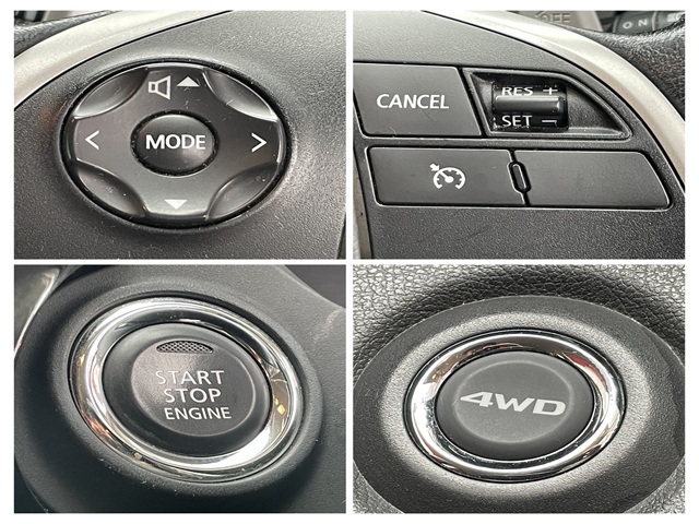 純正HDDナビ CD DVD MSV 地デジフルセグ Bluetooth ハンズフリー バックカメラ サイドカメラ ビルトインETC 革巻ハンドル ステアリングスイッチ オートライト HIDヘッドライト LEDフォグランプ 電動格納ドアミラー 横滑り防止装置 ヒルディセントコントロール シートヒーター 撥水カプロンシート ドアバイザー インテリジェントキー 純正17インチAW パートタイム4WD