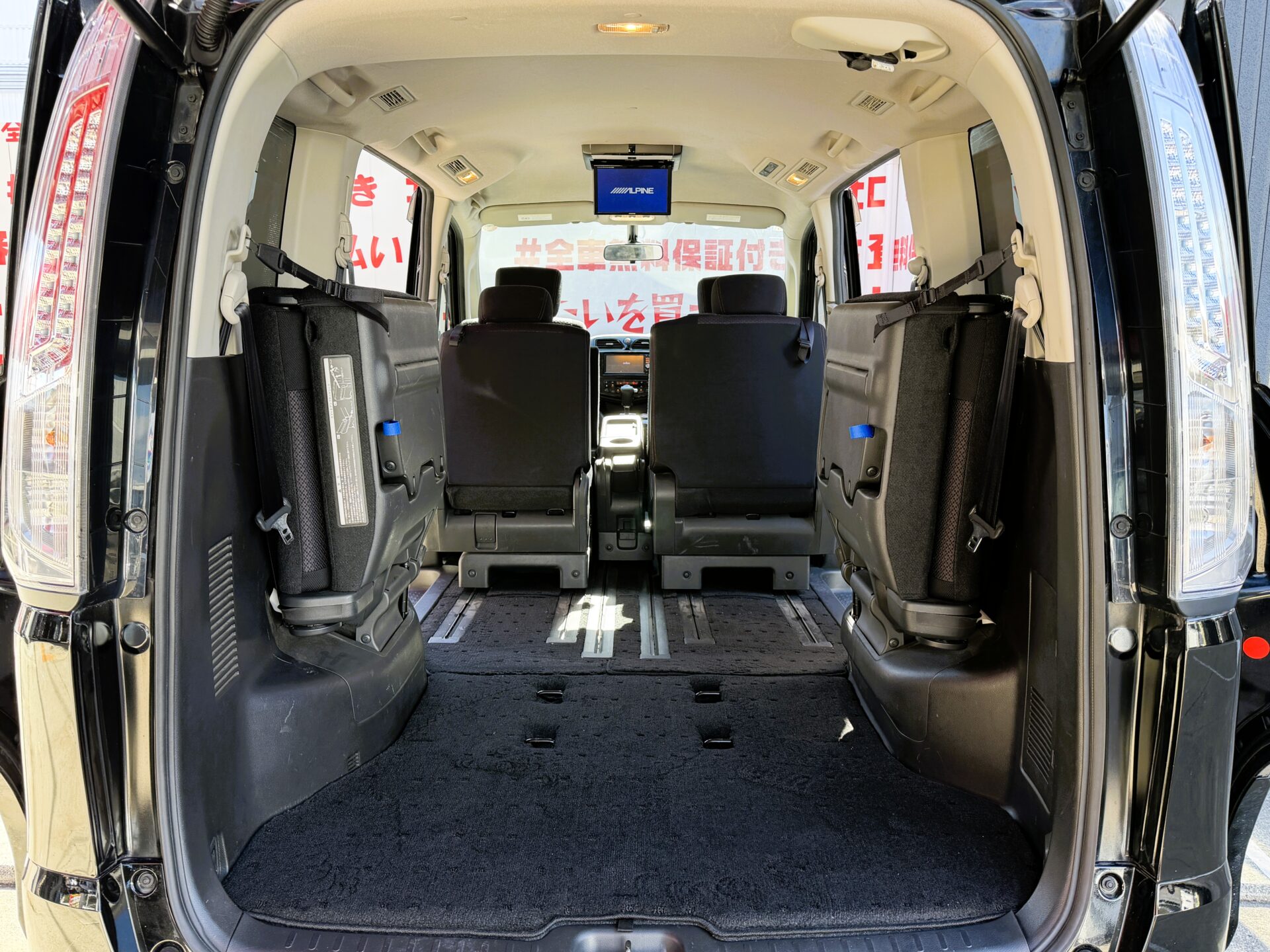 アルパイン8インチナビ DVD SD Bluetooth フルセグ バックカメラ ビルトインETC ウインカーミラー ドアバイザー 革巻きハンドル プッシュスタート インテリジェントキー Wエアコン HIDヘッドライト フォグランプ オートライト 両側パワースライドドアー ウォークスルー クルーズコントロール フロントハーフエアロ リアルーフスポイラー アイドリングストップ 純正16インチAW 納車時新品タイヤ装着