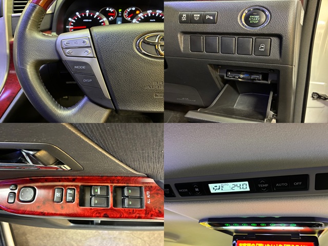 純正HDDナビ 地デジフルセグTV CD DVD Bluetooth サイド・フロント・バックカメラ ビルトインETC 革巻きハンドル ステアリングスイッチ ウィンカー付き電動格納ミラー オートエアコン デュアルエアコン リアクーラー クルーズコントロール 両側パワースライドドア パワーバックドア クリアランスソナー シートヒーター 純正フリップダウンモニター 2列目オットマン付きキャプテンシート オートライト HIDヘッドライト フォグ 社外18インチAW 車検2年付