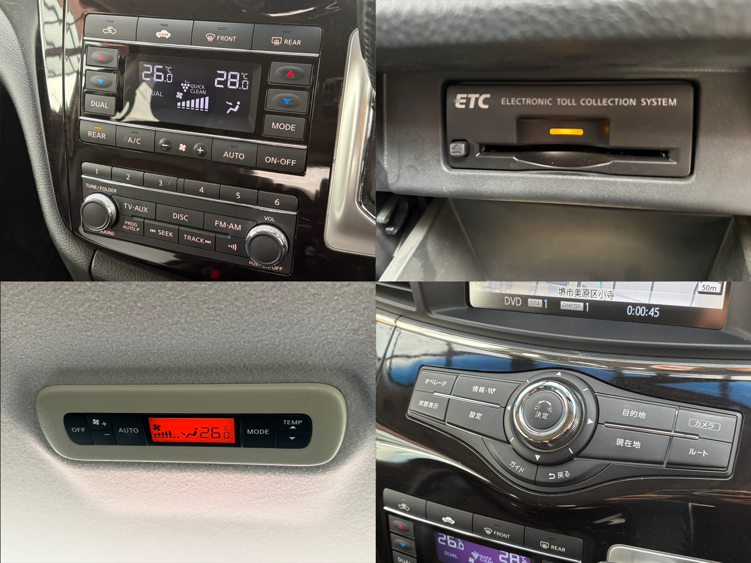 純正HDDナビ(CD・DVD・Bluetoothオーディオ・フルセグTV・ミュージックサーバー) アラウンドビューモニター ビルトインETC 両側パワースライドドア フリップダウンモニター ハーフレザーシート 後席サンシェード 4WD切替スイッチ デュアルエアコン Wエアコン プッシュスタート&スマートキー 革巻きステアリング ステアリングスイッチ 障害物センサー 家庭用コンセント AUTOライト LEDデイライト HIDヘッドライト フォグランプ ウインカーミラー 社外16インチAW ※ノーマルタイヤ(純正18インチAW)4本お付けします